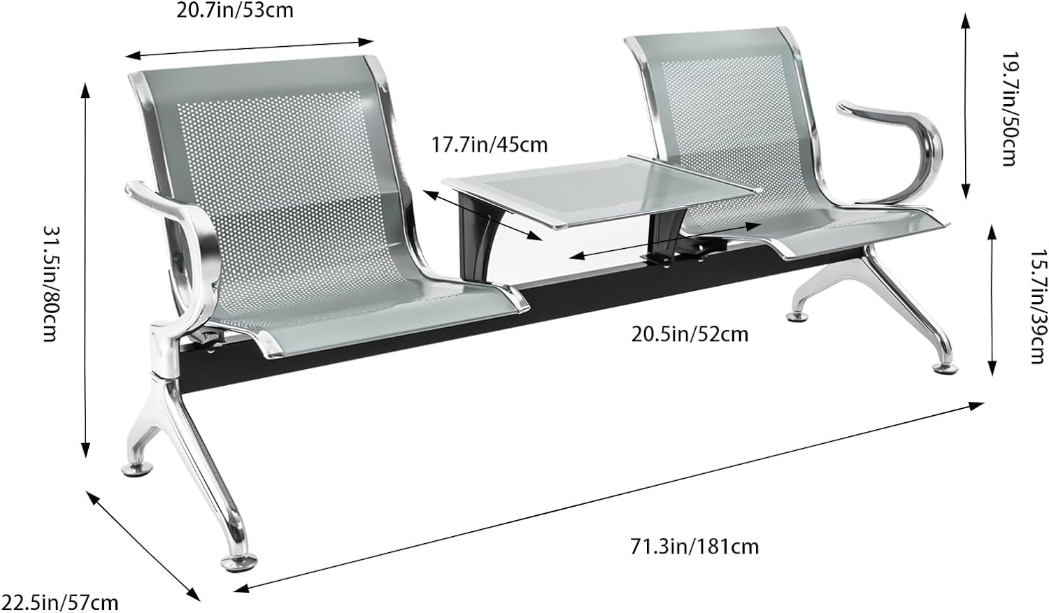 Our 2-seater waiting bench with coffee table is made of aluminum alloy and cold-rolled steel sheet, wear-resistant and sturdy, which can better maintain long-term beauty and practicality.