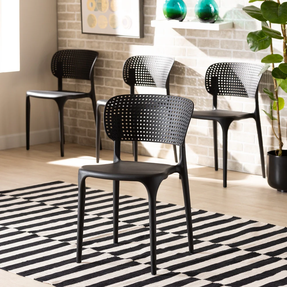 Expand your dining routine with the flexible design of the Rae dining chair. This Black retro plastic stackable chairs is comprised of durable polypropylene plastic in a smooth, neutral finish.